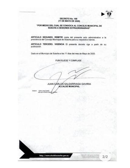 Bajo el Decreto 168 del 11 de mayo de 2020, el alcalde Juan Carlos Saldarriaga convocó al Concejo Muncipal de Soacha para tramitar y discutir el Plan de Desarrollo 2020-2023.